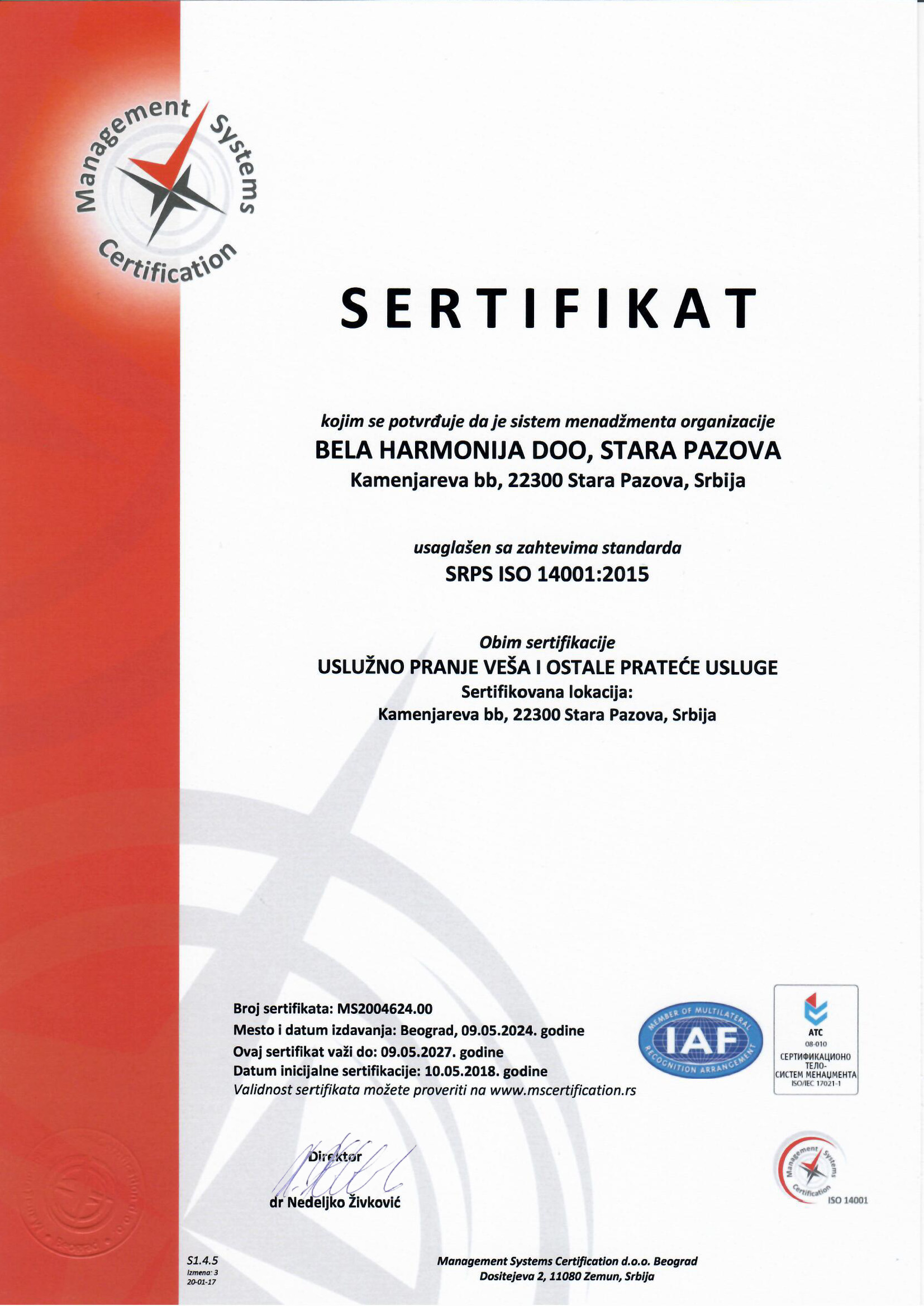 Kompanija Bela Harmonija je sertifikovana sledećim sertifikatima: